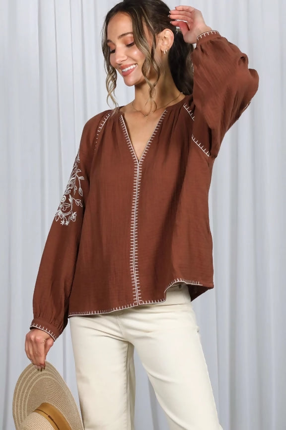 Floral Embroidered V-Neck 100%Cotton Gauze Blouse
